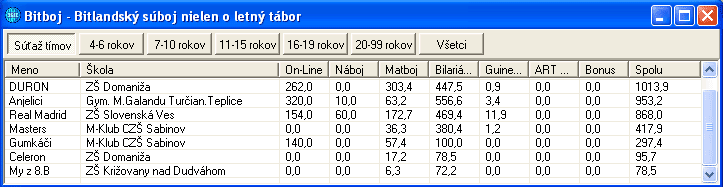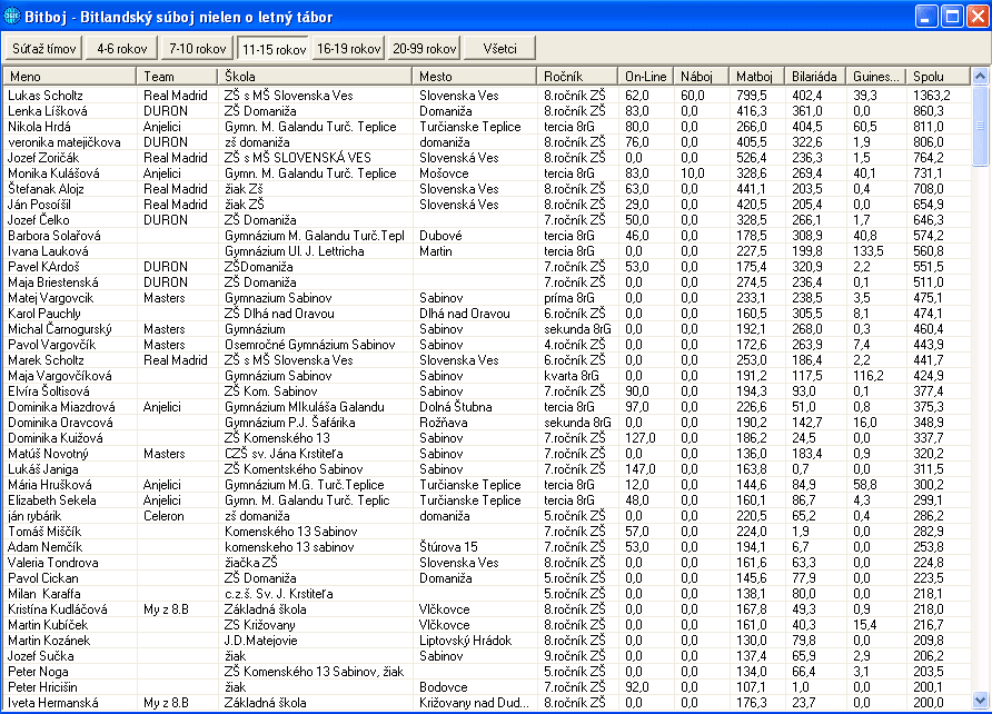 Do súťaže je v kategórii 11-15 ročných aktívne zapojených viac ako 300 detí z celého Slovenska. Zaregistrovali sme 7 školských tímov, ktoré medzi sebou bojujú o účasť na sústredení. Nasledujúce tabuľky dokumentujú aktuálny stav v súťaži.